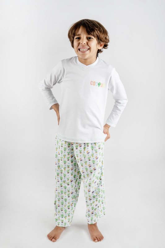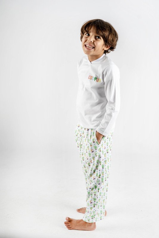 Bedtime doesn’t mean an end to fun. Wear the pajama and get ready for your next adventure. These cactus PJ’s are the cutest addition to your little ones. This sleepwear is made from the finest quality cotton. The pajama is featuring a cozy, soft and breathable cotton top blended with a little stretch for comfy matched with soft Victoria material pants with sleeping cactus print perfect for any little boy. The fabric is brushed for added softness, making the sleepwear feel absolutely luxurious, getting cozier after each wash. In our luxurious sleepwear your little ones will be tucked in love and off to dreamland. Matching top & bottom . Bonne nuit