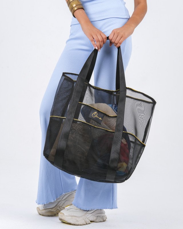 Measuring 45 *30 cm , this over sized beach bag has ample room for all your beach essentials. it has comfortable handles and secure grip even when the bag is fully loaded. It is crafted with durable, water resistant mesh material. The large open design allows sand and water to drain through! The multi pockets design allow easy organization and protection of all your needs.
