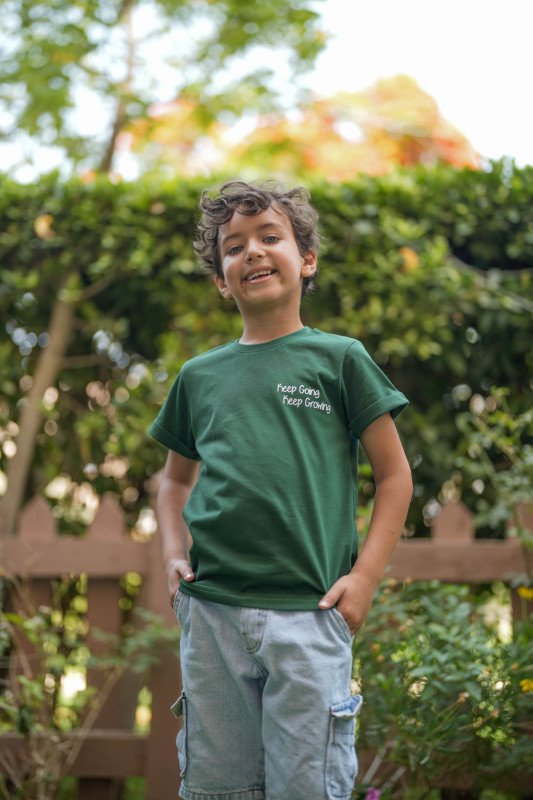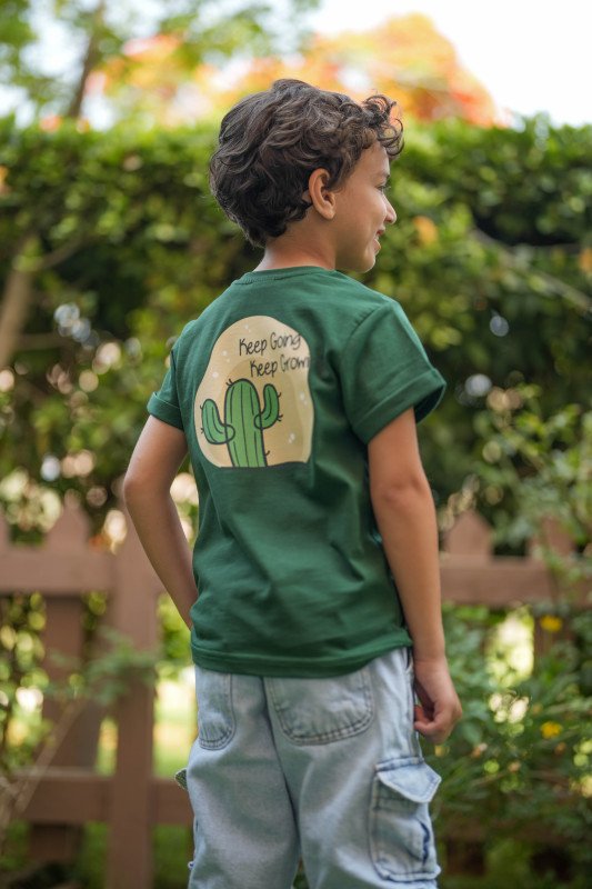 Keep going keep growing T-shirt for boys, made from soft single Egyptian cotton in a classic Cactus cut. The front has slogan for keep going written on chest. Cool and comfortable to wear. This casual tee has short sleeves and a classic ribbed crew neck. Elevate your boy wardrobe with our exclusive T-shirts designed solely for our new concept stores and online visitors. This statement piece embodies the essence of the playtime that never ends. Meanwhile Cactus T-shirt is soft & cut in that just-relaxed enough way we always get right. Wear it with jeans or shorts, layered under jacket so your exclusive piece peeks out.