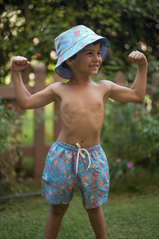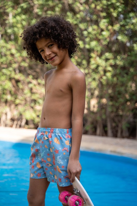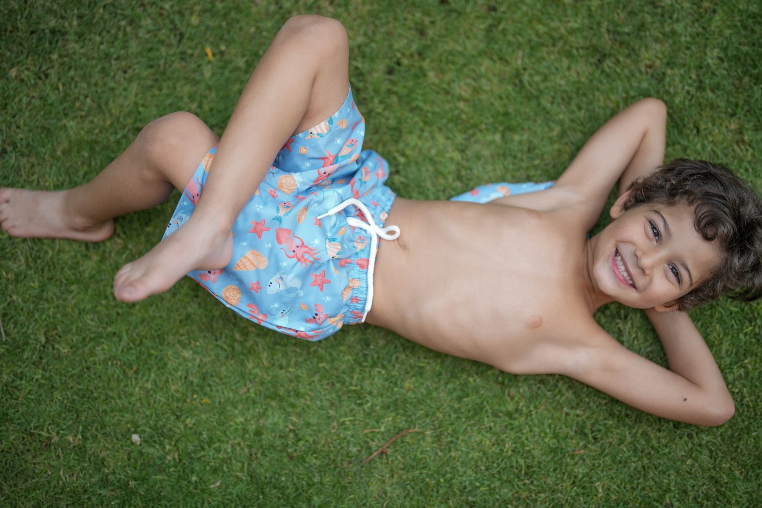 Fun blue swim shorts for little boys with a cute wonderful sea creatures design, it will definitely steal little boys’s heart. Containing quality specialized fabrics that protects against the sun’s UV rays. It is soft, elasticated, a inner soft mesh lining and thanks to its drawstrings, it fits perfectly!