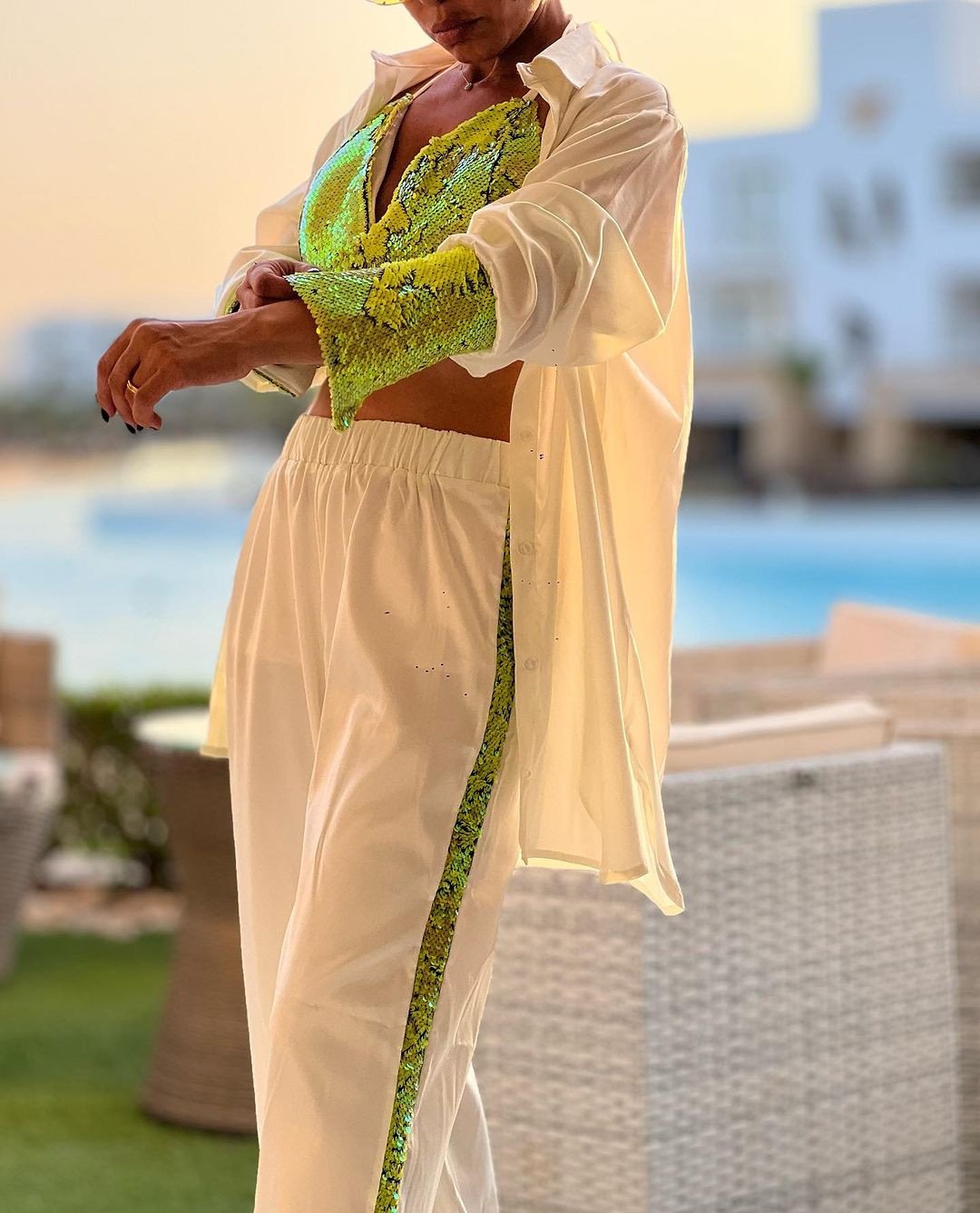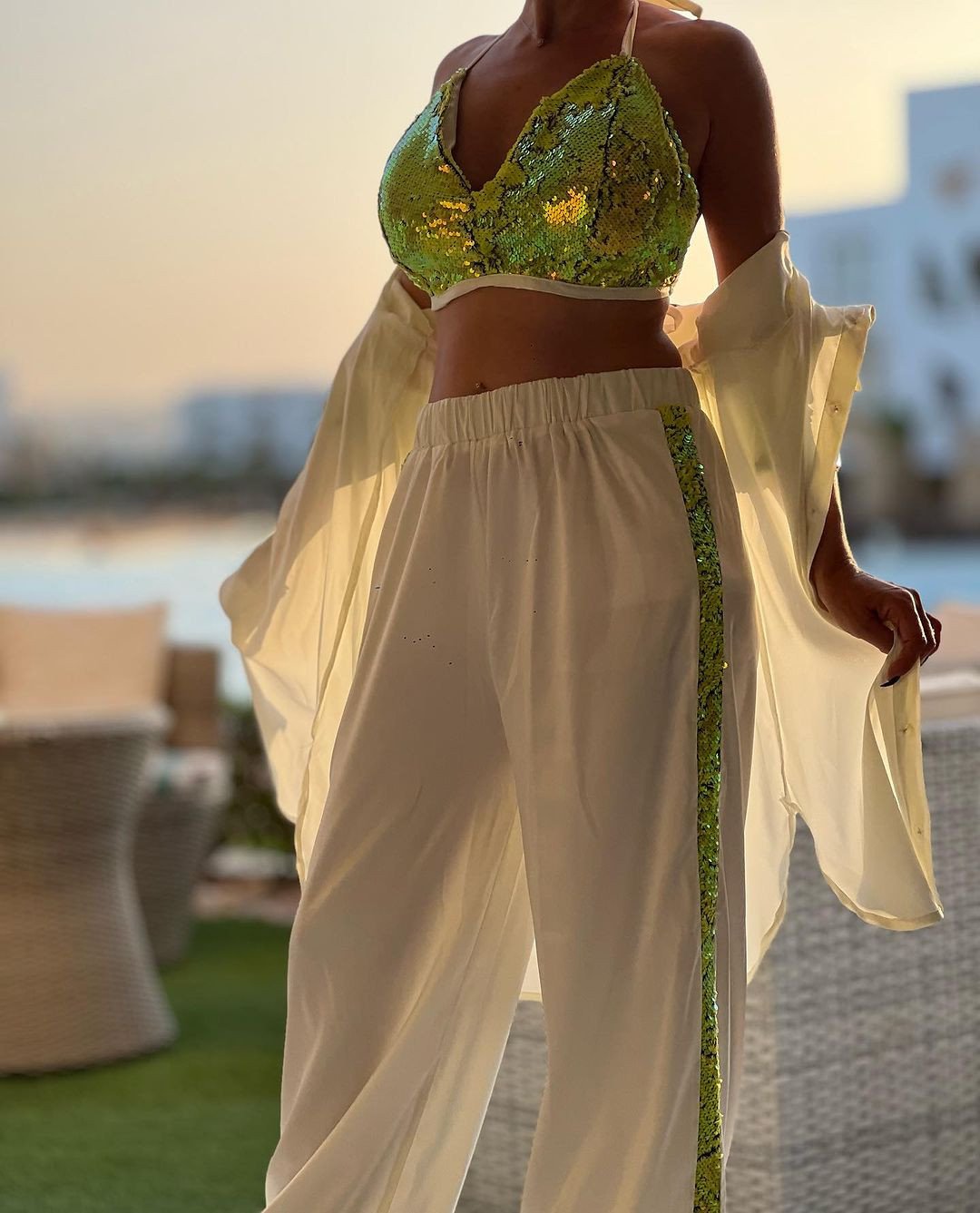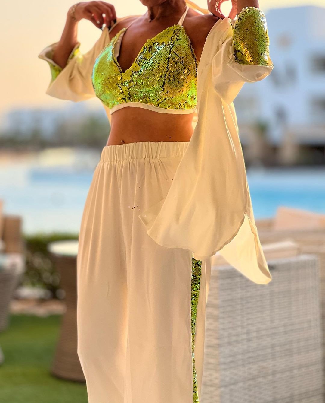 This three-piece white suit, complete with a chic bra and sparkling sequin top