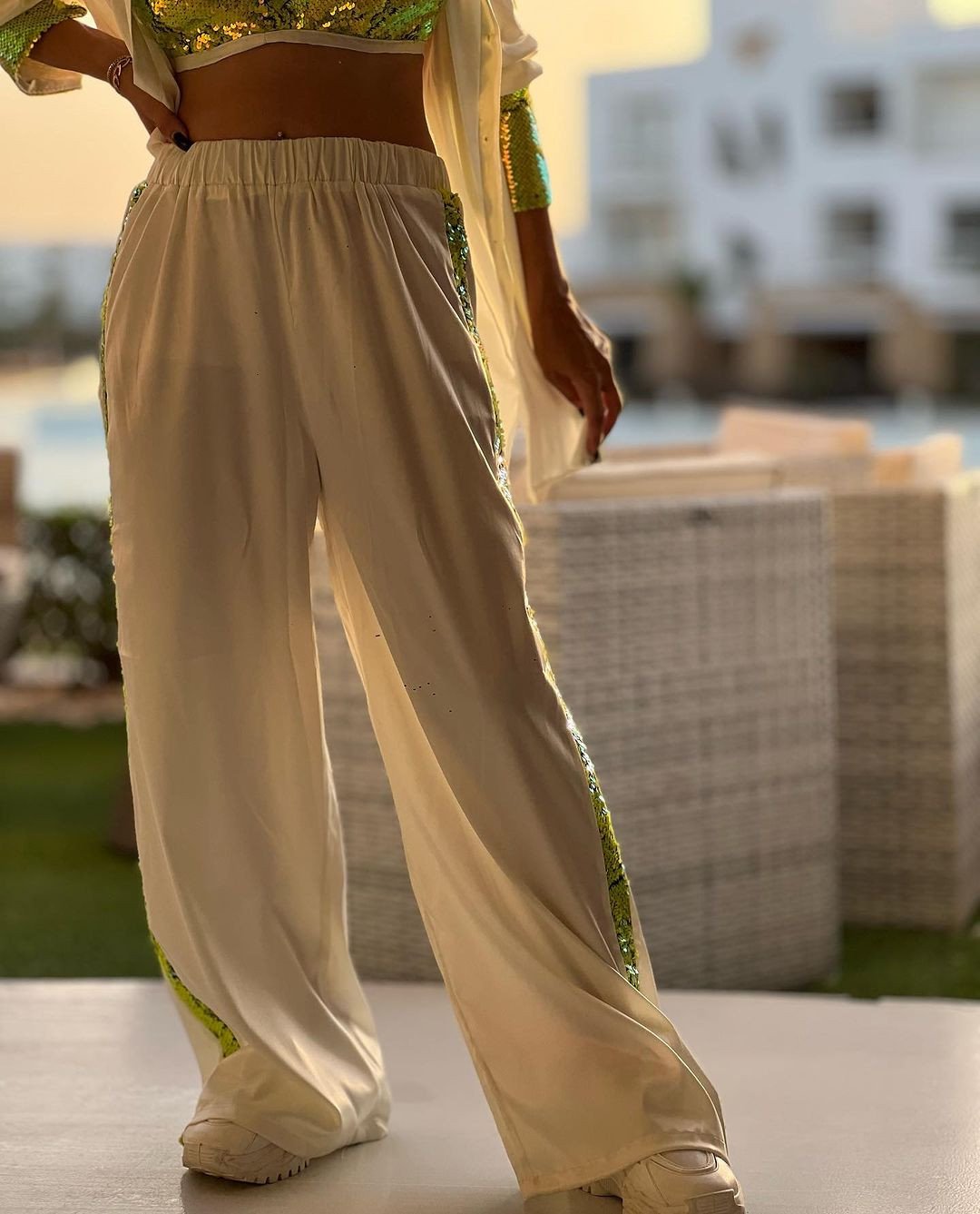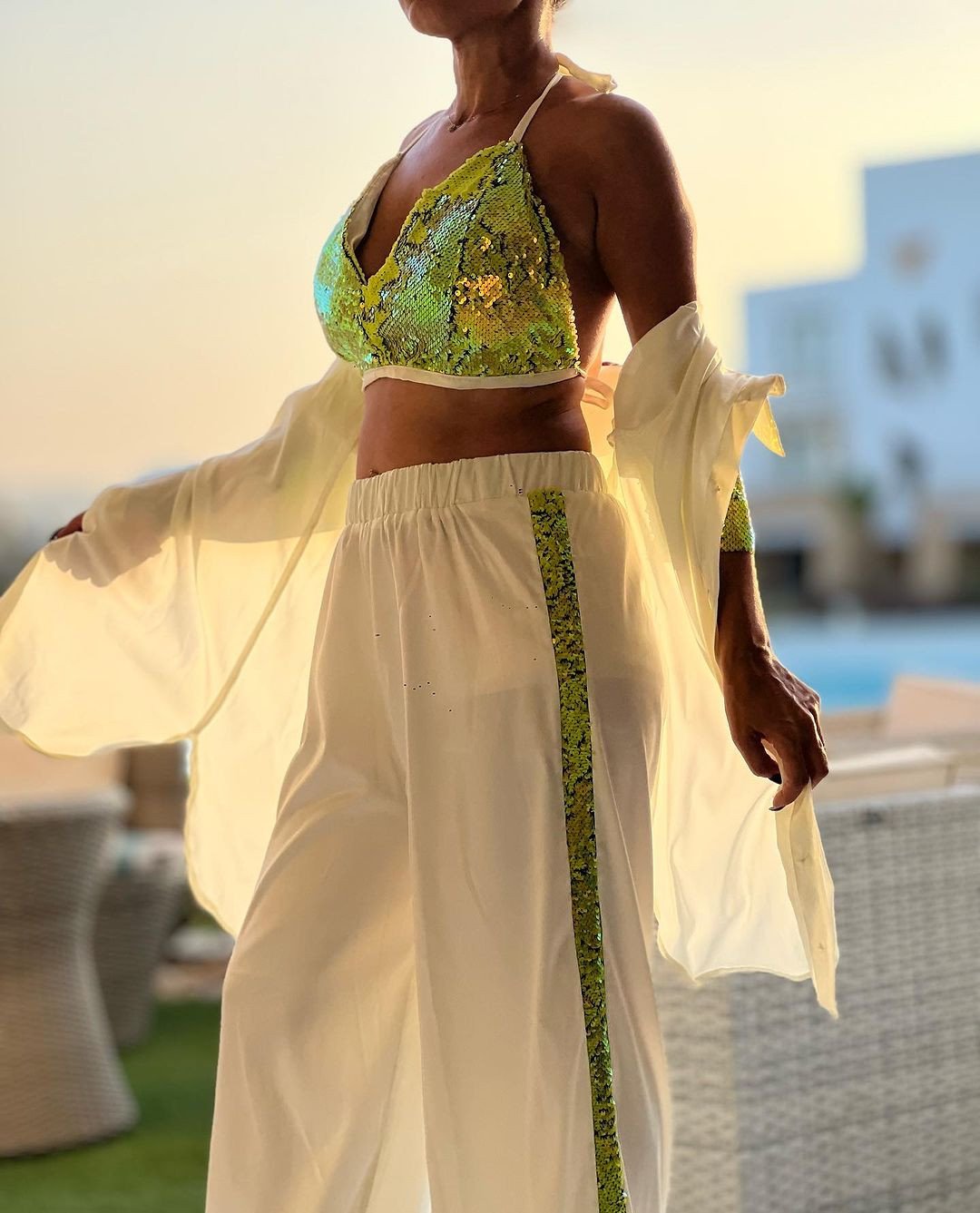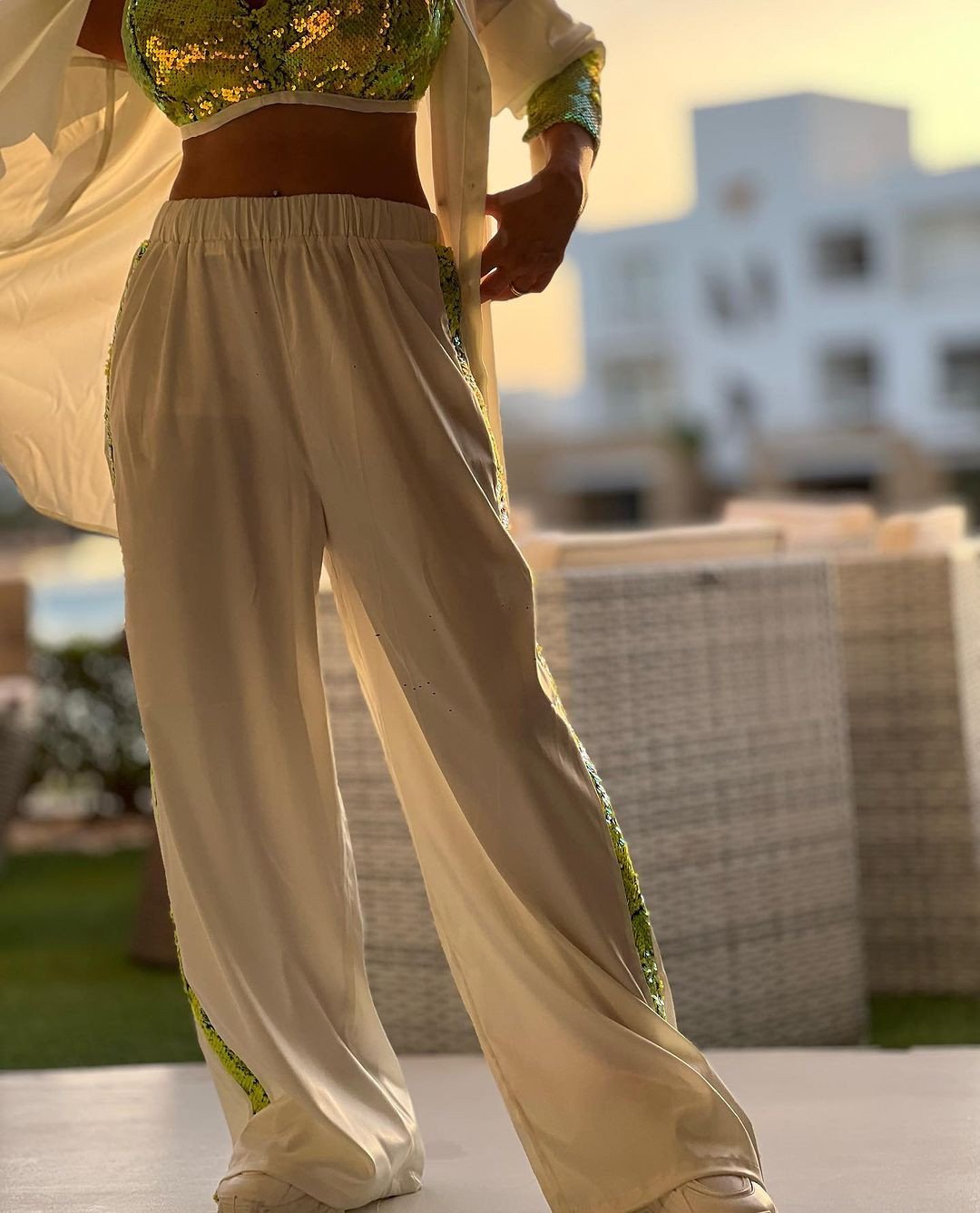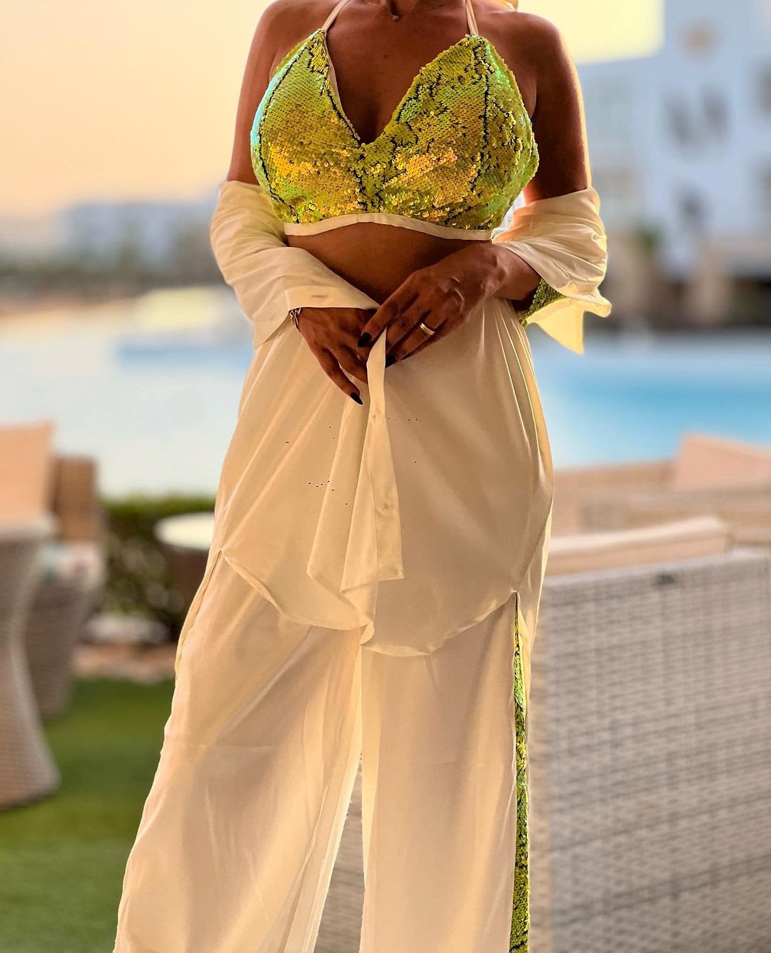This three-piece white suit, complete with a chic bra and sparkling sequin top