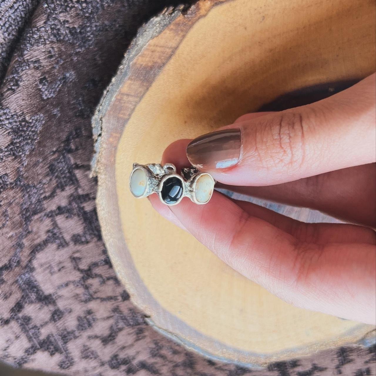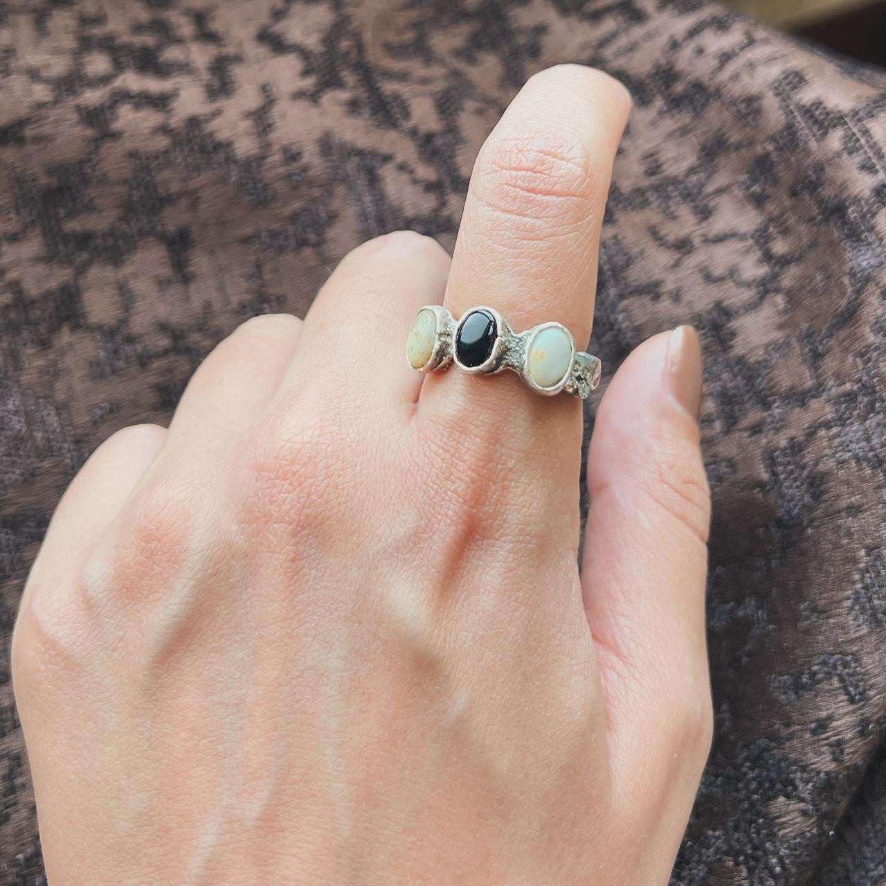 silver free size ring with Black Onyx stone and White Agate natural stone