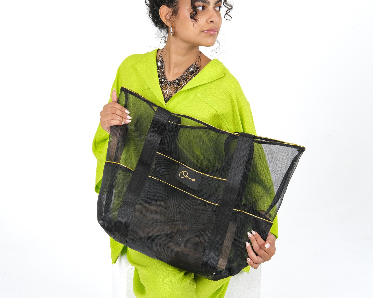Measuring 45 *30 cm , this over sized beach bag has ample room for all your beach essentials. it has comfortable handles and secure grip even when the bag is fully loaded. It is crafted with durable, water resistant mesh material. The large open design allows sand and water to drain through! The multi pockets design allow easy organization and protection of all your needs.